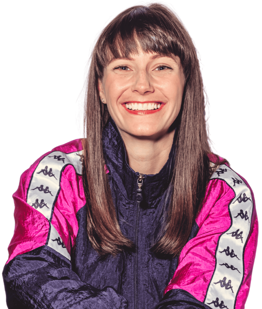 A photo of Jess with straight brown hair and bangs, wearing a colorful pink, black, and gray Kappa jacket.